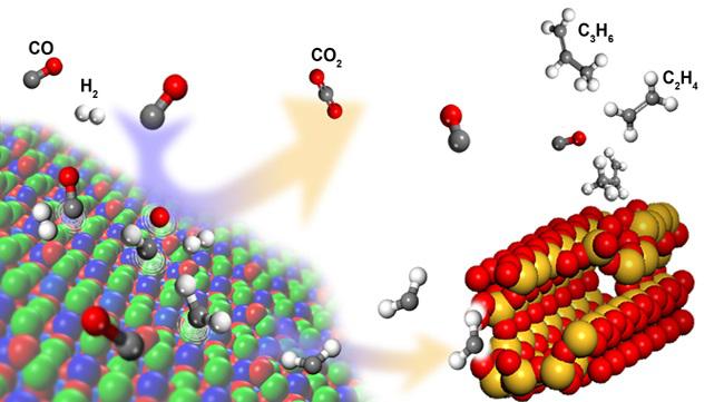 在这篇文章中,该研究团队的科学家们采用了在工业上很有吸引力的反应条件:温度400摄氏度、压力2.5 MPa、氢气/一氧化碳比例1.5、催化剂寿命超过100小时。这种双功能催化剂名为OX-ZEO(Oxide-Zeolite),由金属氧化物 (ZnCrOx)和多孔SAPO沸石(MSAPO)组成。一氧化碳和氢气在金属氧化物表面上被活化,形成含有CH2的化合物,并随后形成烯酮化合物(CH2CO)。后者又从气相中扩散出来进入沸石,并在那里被转化为低级烯烃。该过程的低碳烃类产物(C2-C4)的选择性达到94%,其中低碳烯烃(乙烯、丙烯和丁烯)的选择性大于80%,并且对一氧化碳的转化率达到17%。