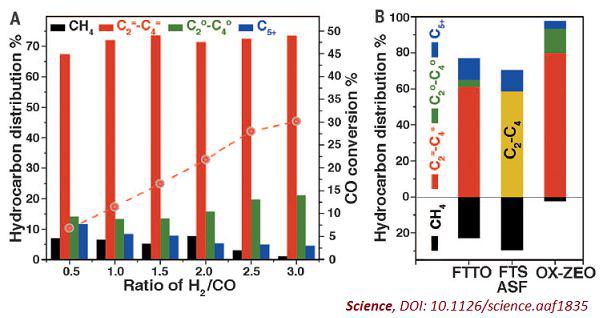 最近,中国科学院大连化学物理所包信和院士和潘秀莲研究员领导的研究团队在《Science》杂志上发表文章,报告了一种新的双功能催化剂,以极高的选择性和效率在一步反应中实现了合成气至低级烯烃的直接转换。(Selective conversion of syngas to light olefins. Science, DOI: 10.1126/science.aaf1835)